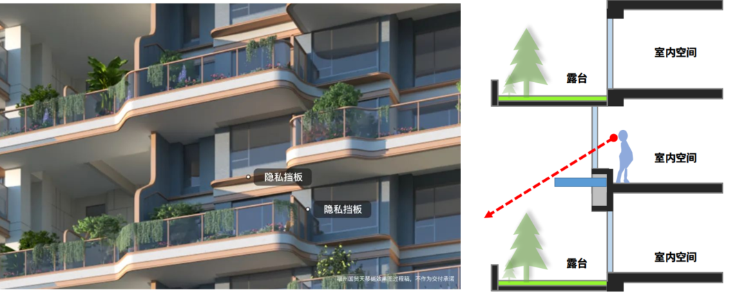利用飘窗结合视线挡板,最大程度规避了上下层之间的视线干扰,更好的保障隐私。
