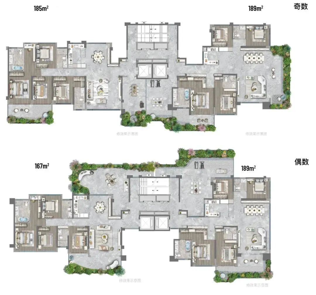 空中花园错层空中花园是第四代住宅的一大特点,如何做到奇偶层空间平权,不顾此失彼是设计师在规划时期设计的重点考量。花园奇偶层设计上遵循平权主义,做到差异最小化,每层每户都配备南向空中花园,采用转角厅+空中花园的形式,让奇偶层空中花园始终围绕客厅核心功能展开,在露台设计上均衡户外户内关系,最大限度让出公共空间。