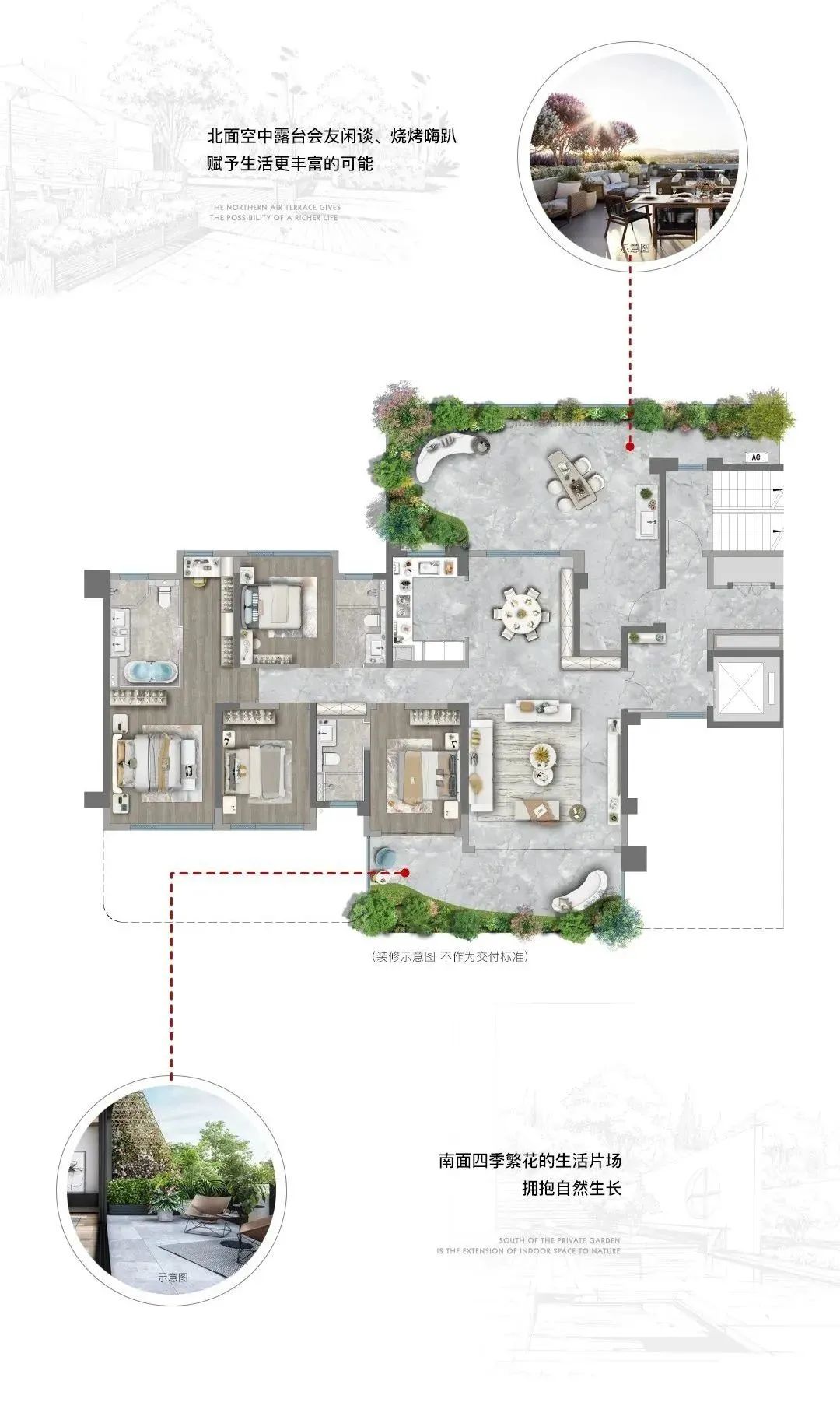 南北向、奇偶错层挑高布局共享式超尺度露台,与户内空间分隔,对户内完全无遮挡,兼顾私密性与采光的同时,令居住的功能和场景更为多元化,最大化实现生态住宅的花园生活。