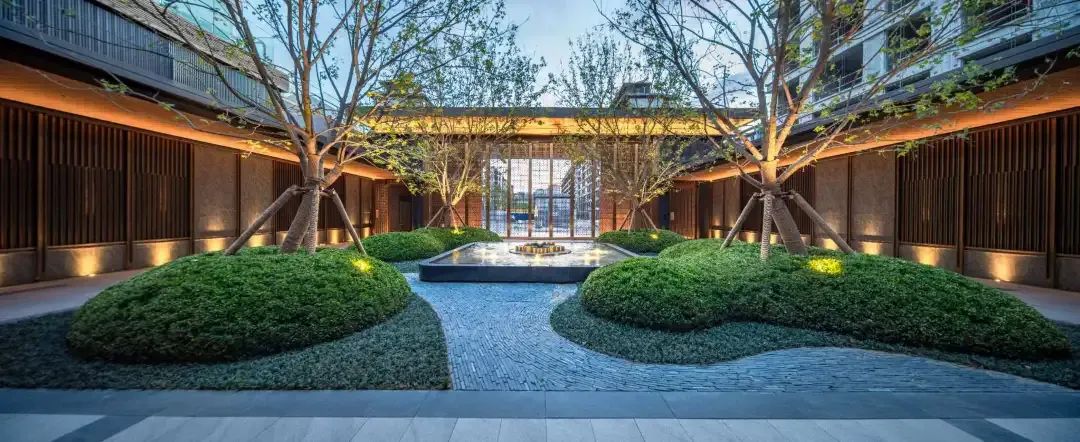 架空平台下,结合下沉庭院、打造奢隐的私家社区生活组团,融合山川河岳的东方园林与私家会所空间,形成生态自然的社区活动空间。