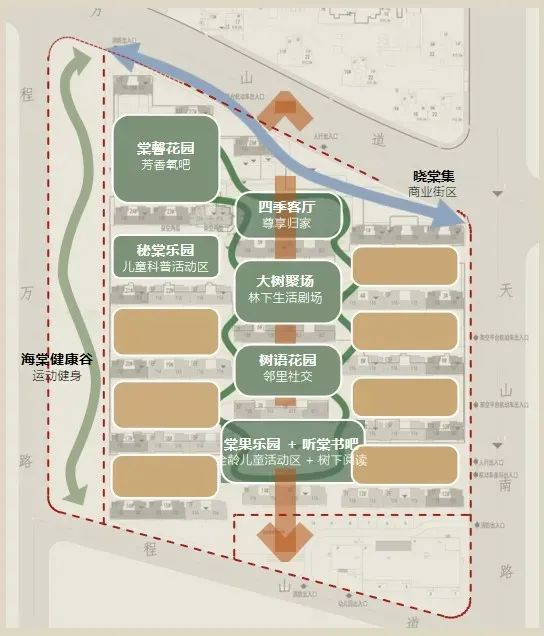 通过“壹里繁华”商业街区和口袋公园的结合,成功打破了传统社区围墙的束缚,从线性切割到立体渗透完成了社区内外空间的重构。