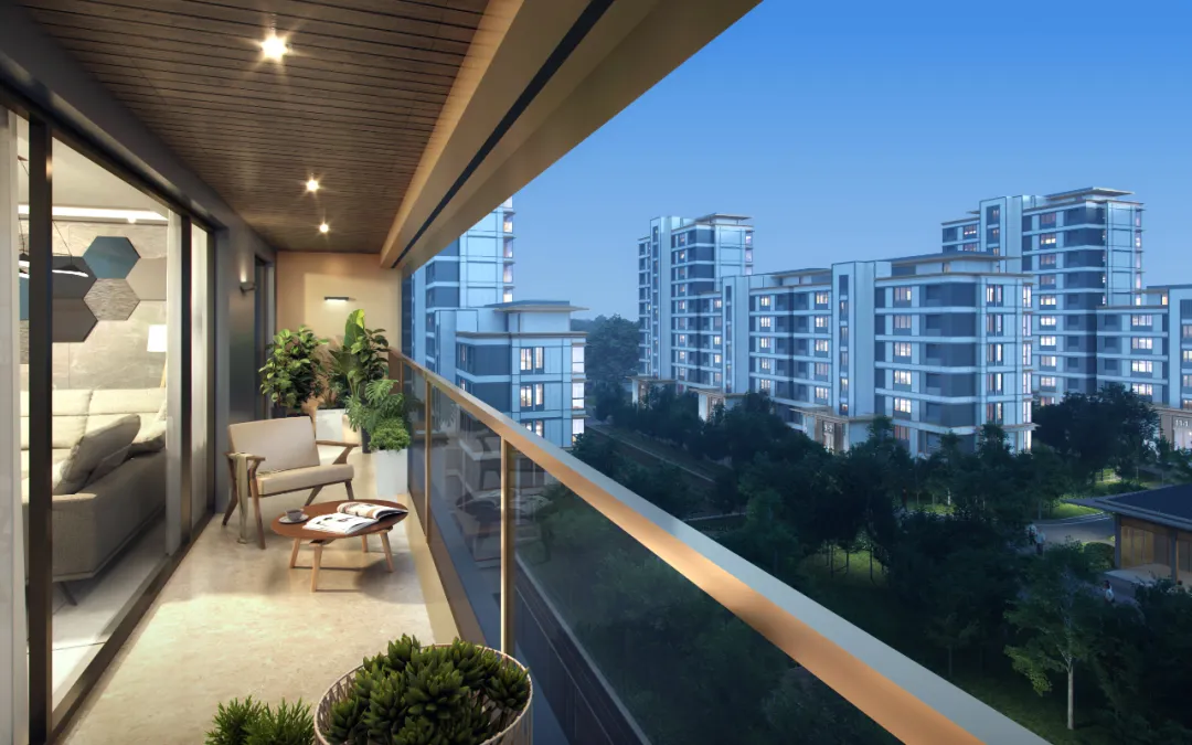 开敞式阳台的玻璃栏板,犹如一个个嵌入建筑本体的悬浮「玻璃盒子」。