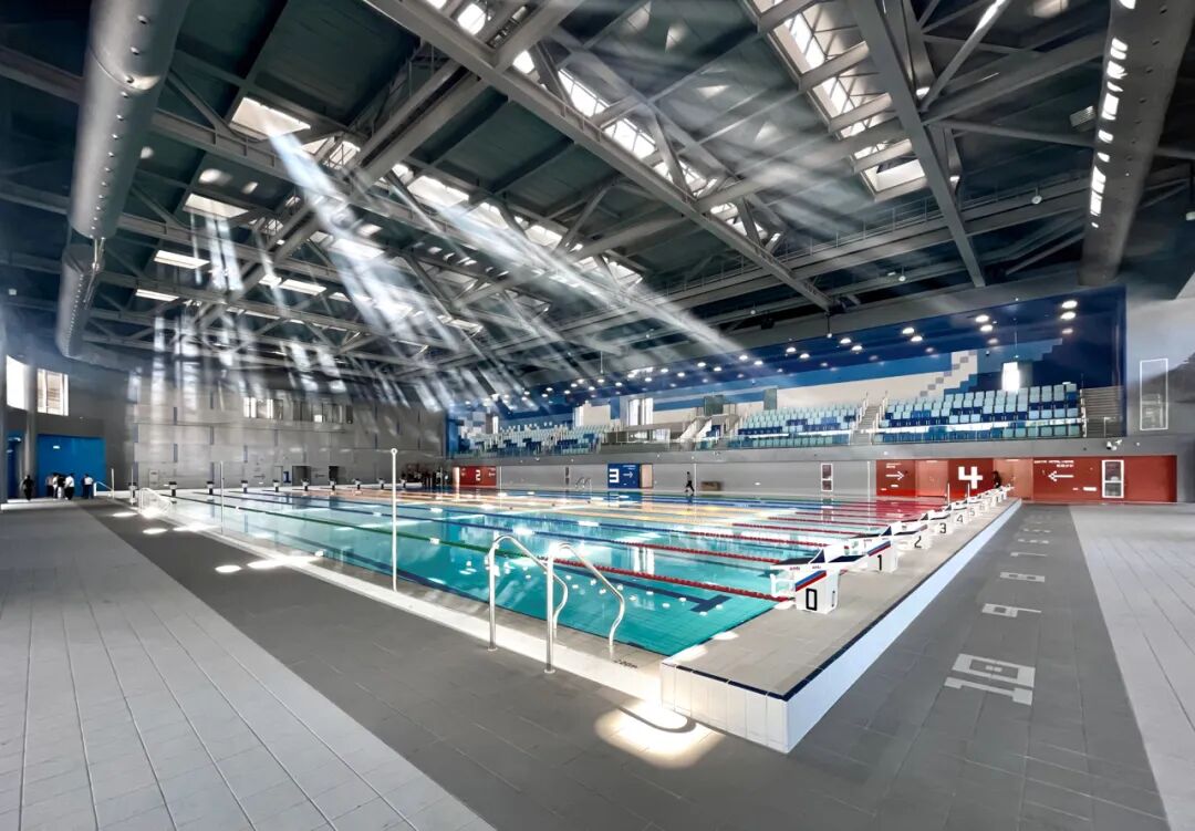 The interior design continues the logic of the folded exterior envelope, applying a modular and "pixelated" language to the treatment of walls, ceilings, and signage systems. In the pool halls, the full-span roof structure is left entirely exposed, with trusses reaching up to 48 meters. This deliberate visibility highlights the structural logic and reinforces the spatial scale and sense of strength expected of a sports facility.