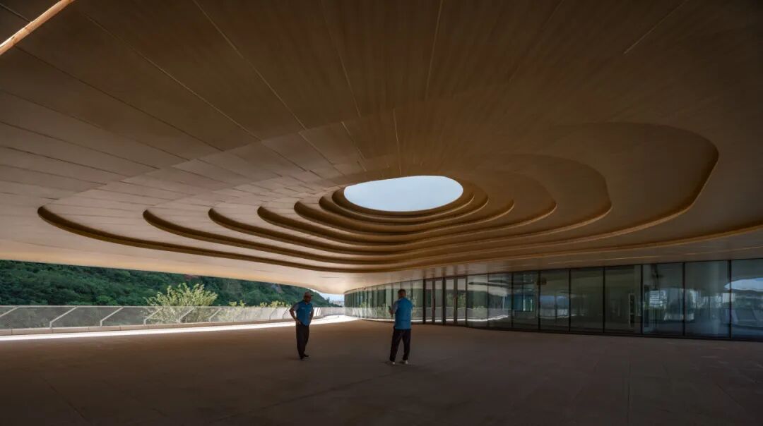 在整体造型策略上,建筑并未采用对称或封闭式构图,而是通过顶面、斜面与垂面三类界面之间的连续过渡,形成一种三维折转的自由体量语言。屋顶曲面通过参数化控制与结构计算,精确过渡至东西两馆之间的多功能连通空间,创造了一个介于室内与户外之间的半开放公共灰空间。