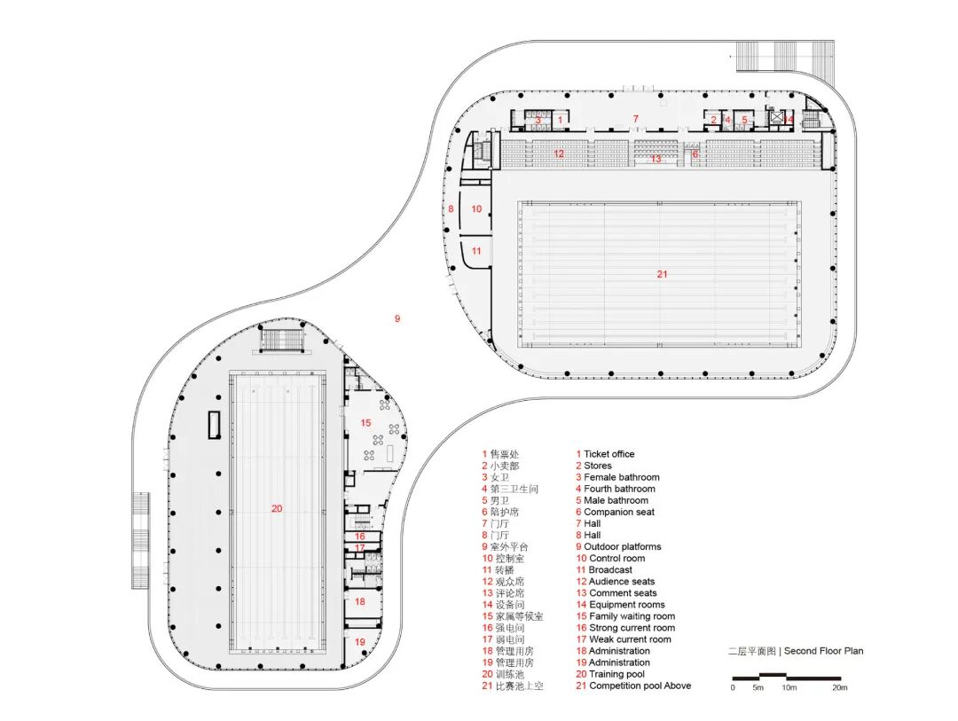 两馆之间的折角连接区域作为场馆的交通核心,通过形体错动形成视觉与功能上的空间节点。观众主入口位于两馆之间,配合螺旋状向内收拢的屋顶构造与挑空平台,构成整个游泳馆最具仪式感的抵达场景。该空间既是观演、等候、集散的节点,也是城市公共生活的一部分,鼓励市民在非消费性空间中自由穿行、驻足、休憩,使建筑不止服务赛事,更回应城市日常。