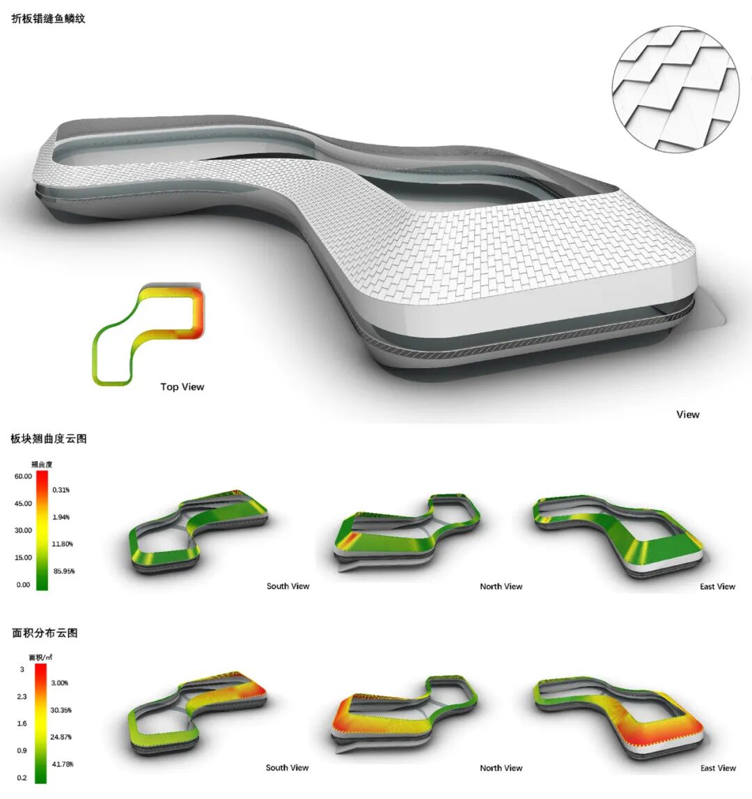 In terms of overall formal strategy, the architecture avoids symmetrical or enclosed compositions, instead employing a continuous transition between horizontal, sloped, and vertical surfaces to generate a free-form, folded massing in three dimensions. The curved roof surfaces are precisely calibrated through parametric modeling and structural analysis, enabling a seamless connection between the two halls on the east and west sides. This transition gives rise to a semi-open, interstitial public space—neither fully indoors nor out—that functions as a shared urban threshold.