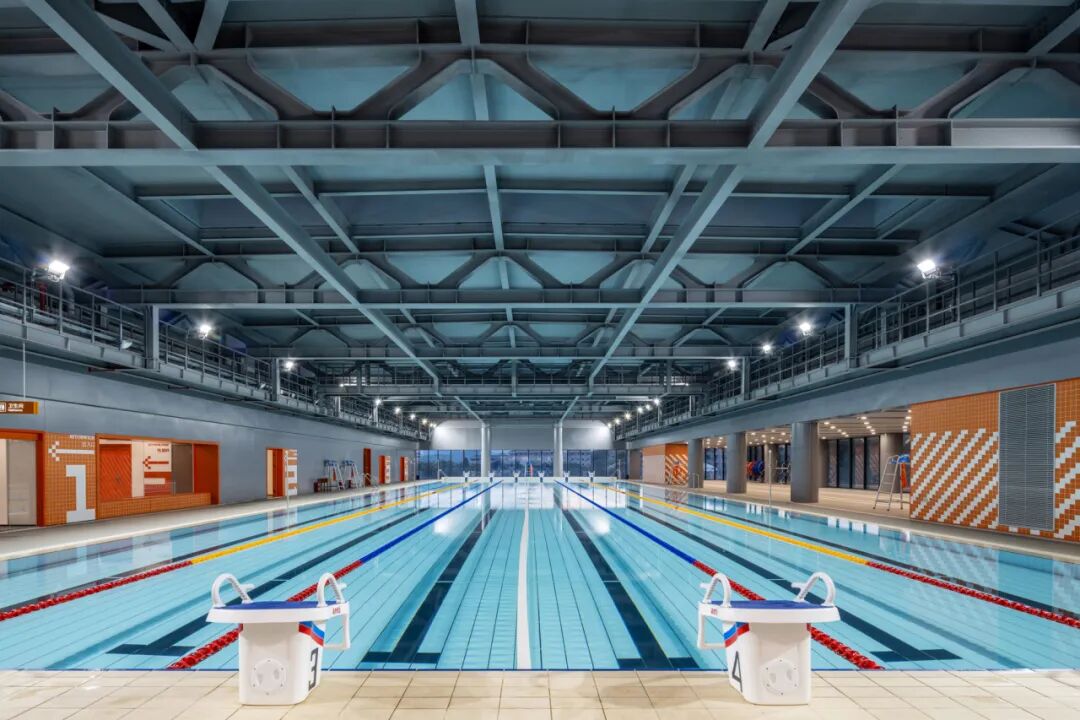 项目室内延续外部折板逻辑,通过模数化与“像素化”的设计语言处理墙面、吊顶与标识系统。泳池区域顶部结构全数裸露,桁架跨度长达48米,在视觉上强调结构逻辑的显性表达,强化体育场馆的空间尺度与力量感。