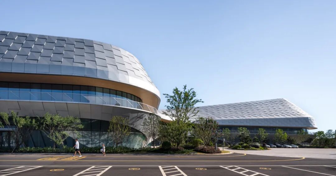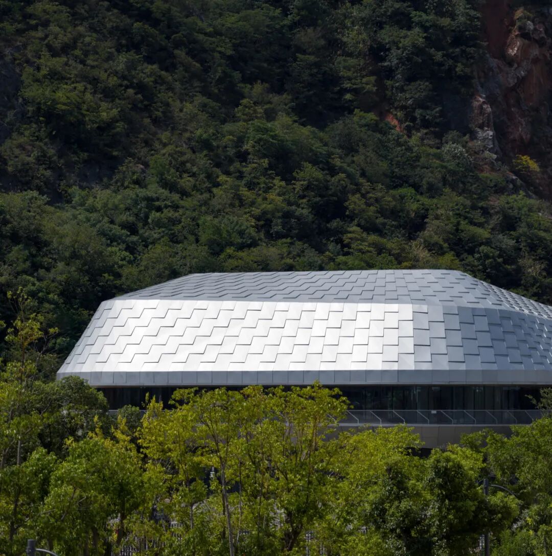 建筑外立面采用了以“折板错缝”为主的金属鱼鳞板系统。每块金属板表面均带有一条角度变化的折痕,随着立面曲率与阳光方向变化产生鳞片般的光影效果。这种由点、线、面多维组合而成的立面构成方式,不仅提升了材料的肌理层次,也在视觉上进一步强化了“水的流动感”与“山体的起伏感”。折板之间疏密变化的节奏,使连续立面在不同尺度上兼具统一性与动态表现力。