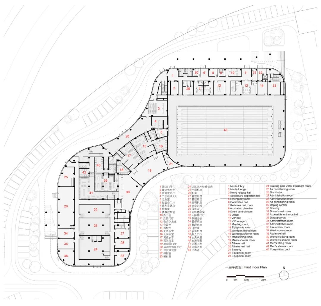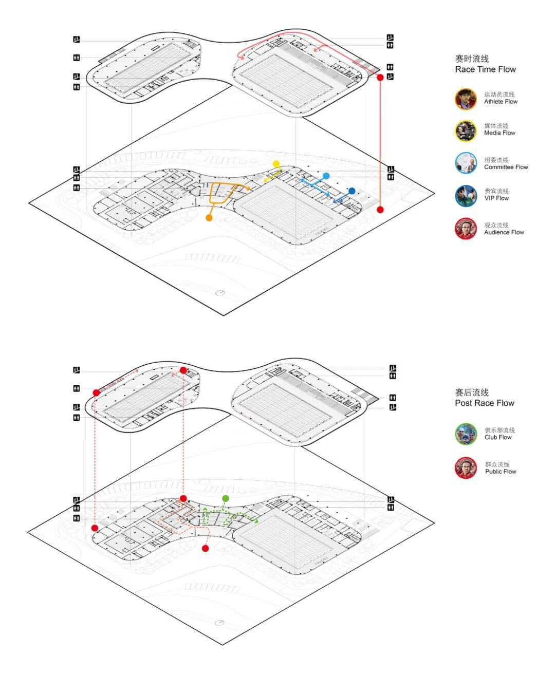 场馆采用双首层组织策略以优化运营与流线:常规使用中,观众与运动员分别通过不同入口进入各自区域;赛事期间,则通过二层看台、专属通道与功能房间实现观众、运动员、媒体、组委及贵宾之间的分流,避免交叉干扰,提升运营效率。