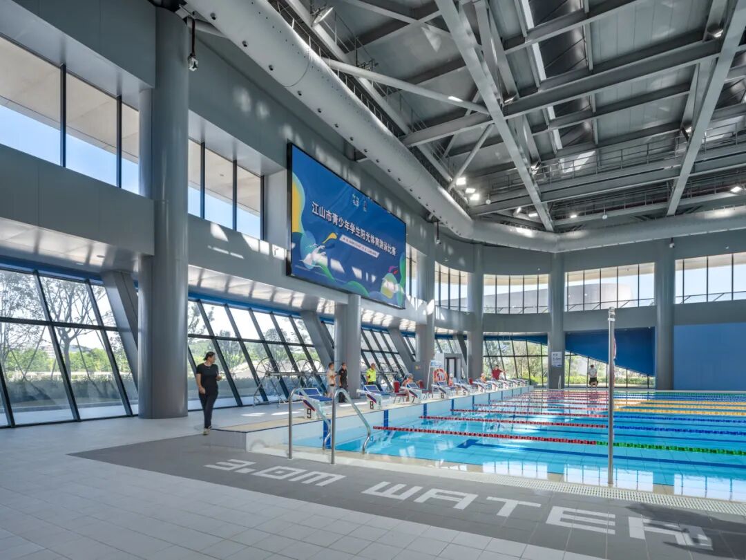 The Hushan Sports Park Swimming Center in Jiangshan was designed by LYCS Architecture, which led the project's integrated architectural and interior design. Located in the heart of Hushan Sports Park, the facility is the first professional-grade swimming venue in the city to meet Class B national competition standards. With a total floor area of 14,244 square meters, the center includes a standard competition pool and a training pool, serving as a multifunctional venue that accommodates both professional events and daily public use.