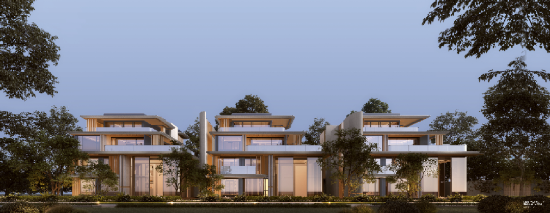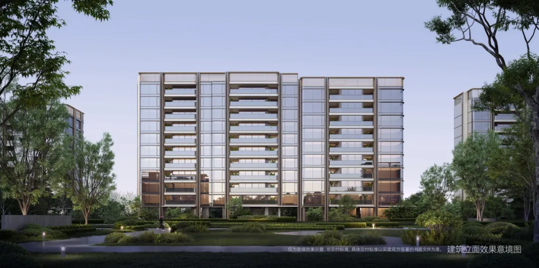 洋房建筑立面延续了“弧形倒角+类幕墙”的设计语言,将三圣乡万亩景观装进360度的环幕大屏中。