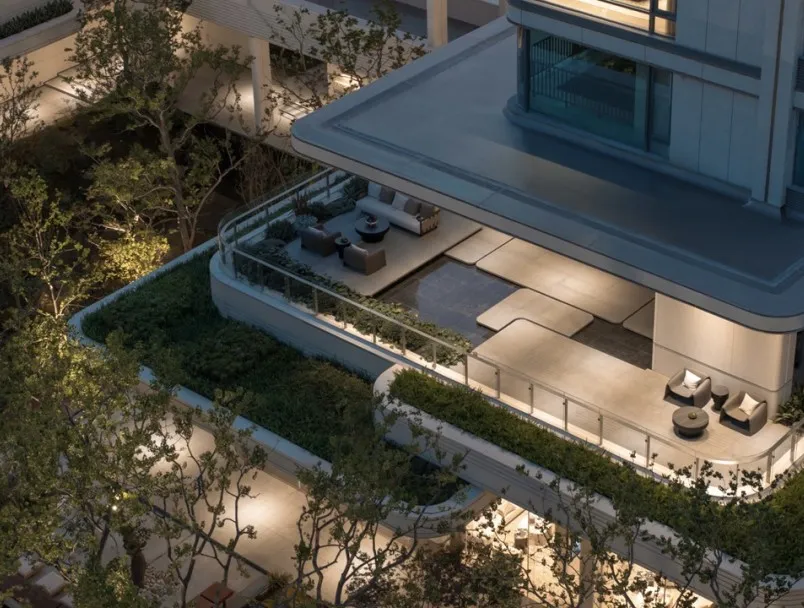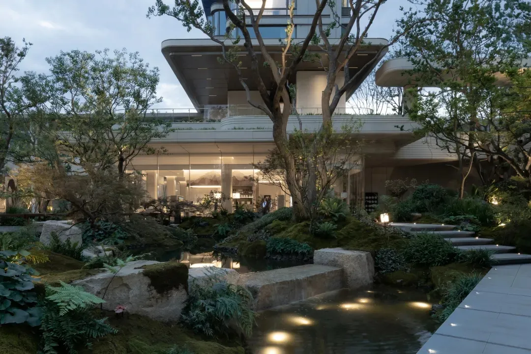 下沉式庭院,巧妙运用层级叠水景观,尽显精致奢华与优雅气质,营造出鲜明的空间领域感。