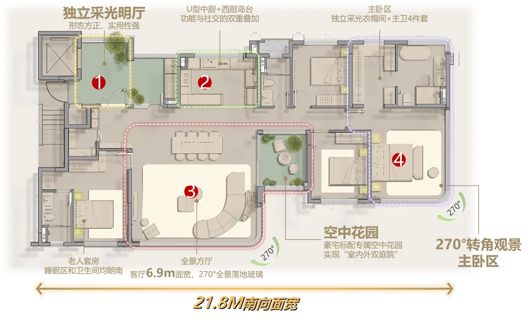 客厅以 6.9 米超宽面宽搭配 270°全景落地玻璃,将窗外美景毫无保留地揽入室内,视野开阔无垠。豪宅专属的空中花园,巧妙实现“室内外双庭院”的独特格局,让自然与生活无缝交融。270°转角观景主卧区,私享极致景观视野,独立采光明厅更添通透质感。整体户型形态方正,空间规划合理,实用性强,每一处细节都彰显着尊贵与舒适。