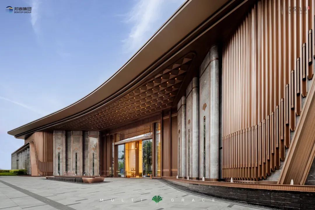 色彩选用香槟色与米白色为主,屋顶为飞檐设计,搭配挺拔修长横竖线条,转角采用圆弧过渡,呈现出现代时尚工业品般的精致,给建筑增添一份灵动和艺术美感。