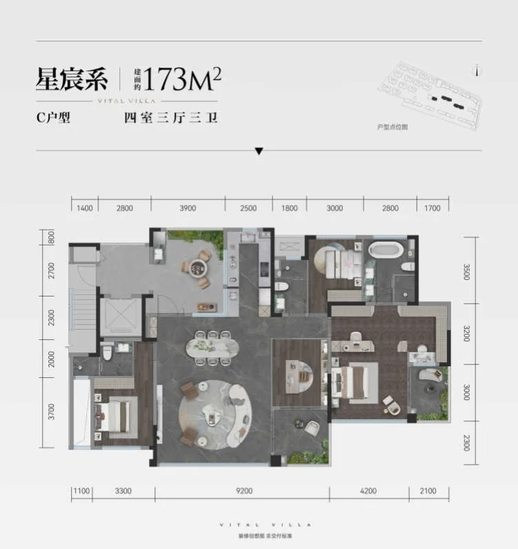 成都邦泰·悦九章约143㎡户型,做到了套四双套房三卫,惊喜的是层高约3.3米。