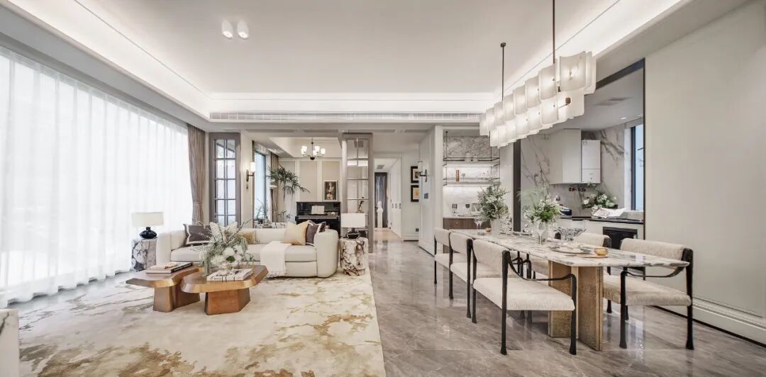 架空层整体约6米起步,而3栋一层一户大平层底部架空层均统一采用高达约9米的极致层高,结合三面玻璃幕墙环绕,以“去边界化”的设计消解了建筑的封闭感,将自然光最大限度引入室内,使大堂成为盛满光影的「透明容器」,化作社区公共空间的天然布景。室内石材的艺术化造型与地面、墙面的通铺设计,带来了非凡的空间体验。