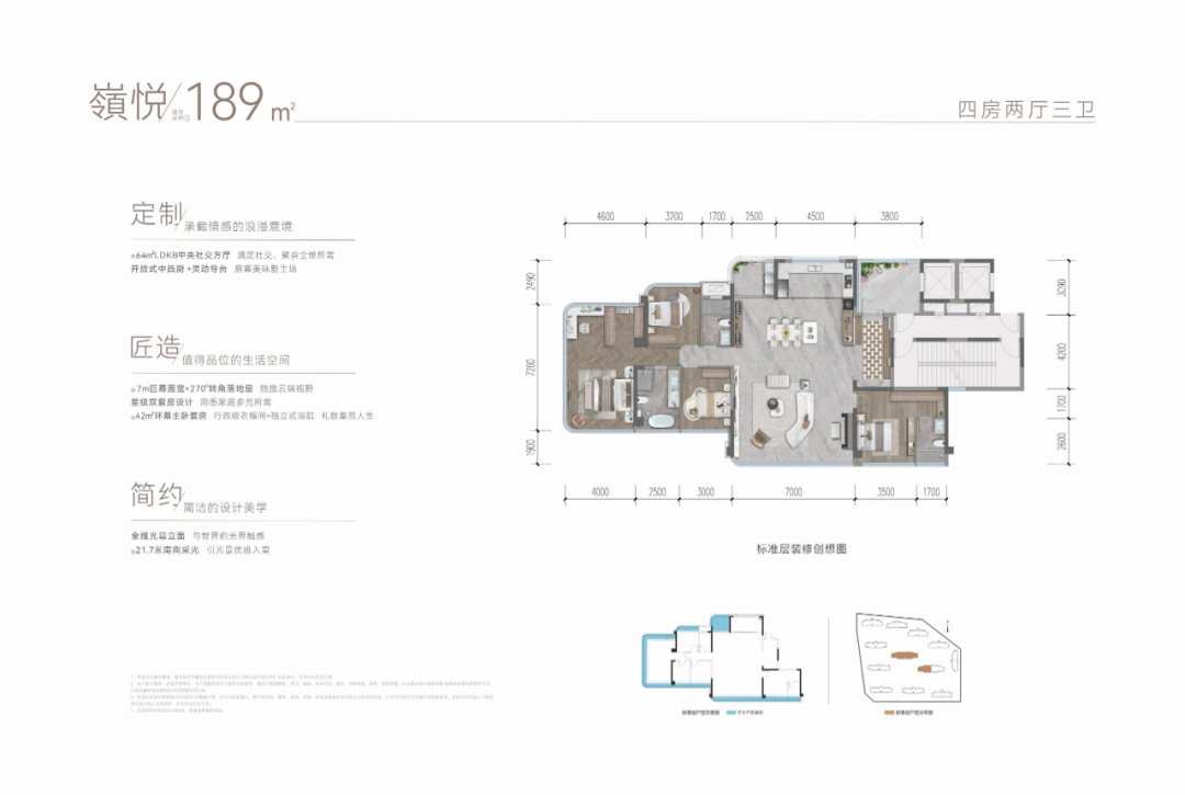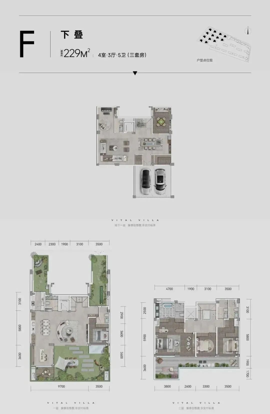 上叠:首层以0卧室设计打造超级社交场域;四层全套房配备观景窗;五层超百平女王平层,实现大平层尺度的立体化表达。