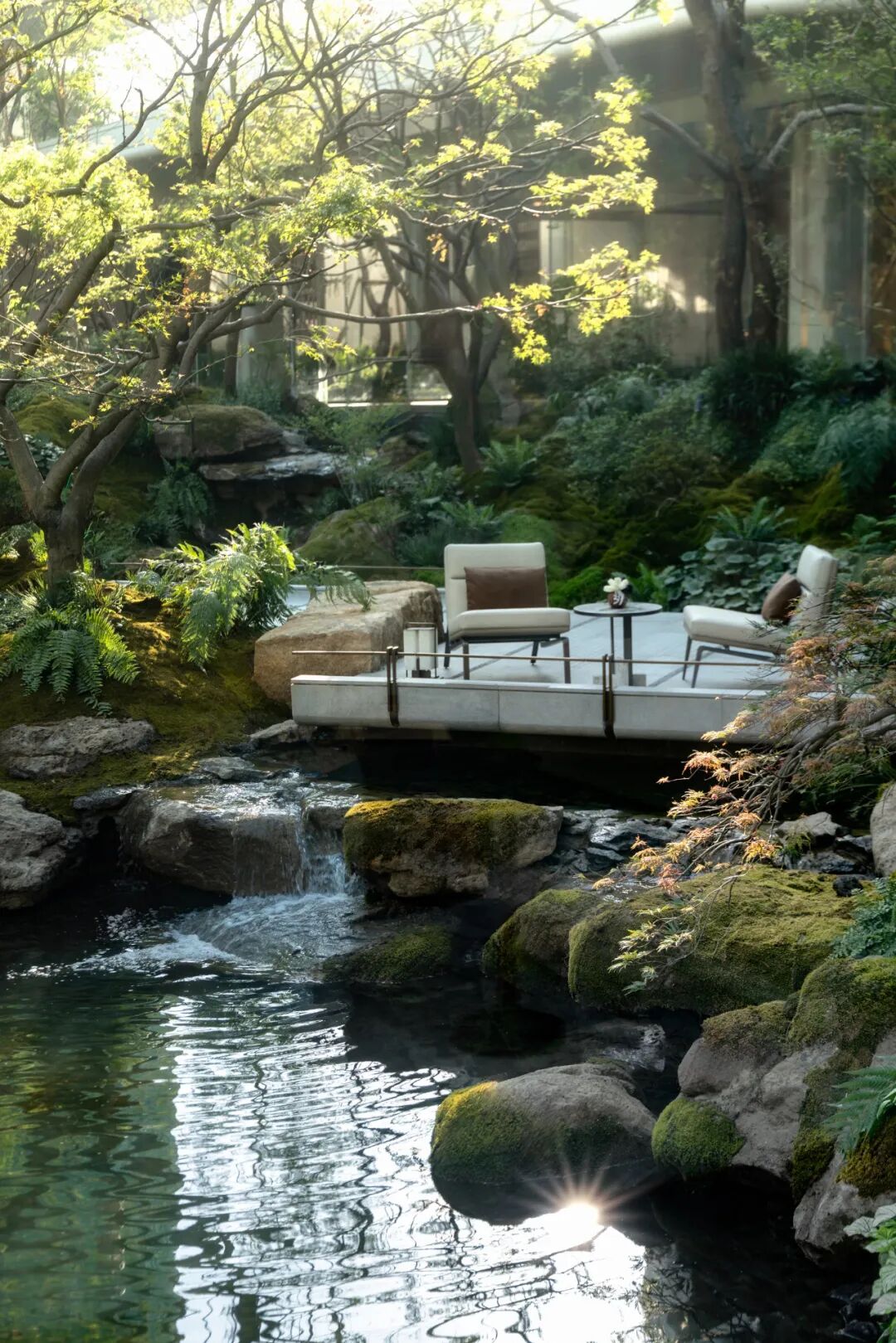 葱郁繁茂的树木以自然之姿,于3500㎡的下沉庭院肆意生长,与清澈溪涧共同勾勒出一幅"层林掠影,曲径通幽"的 林下自然峡谷。