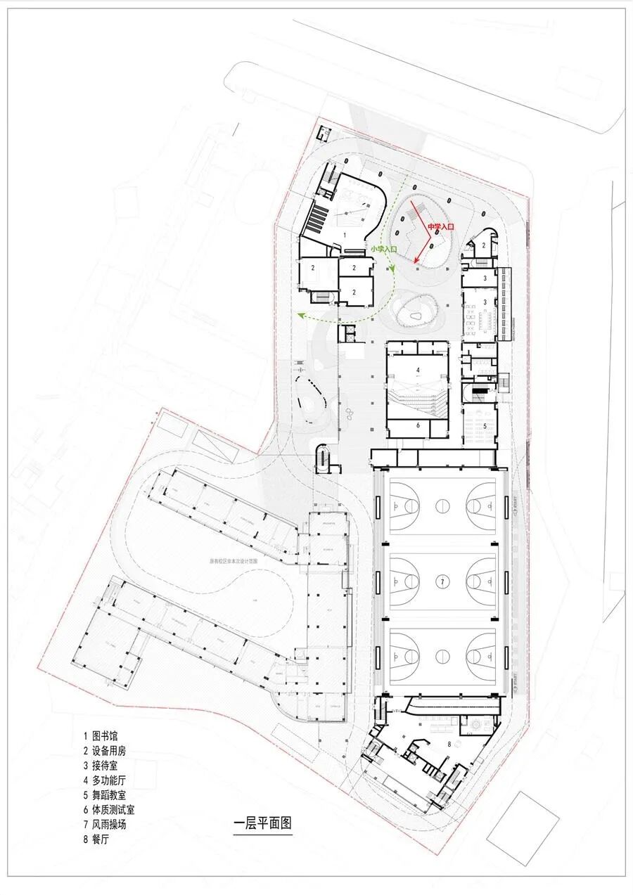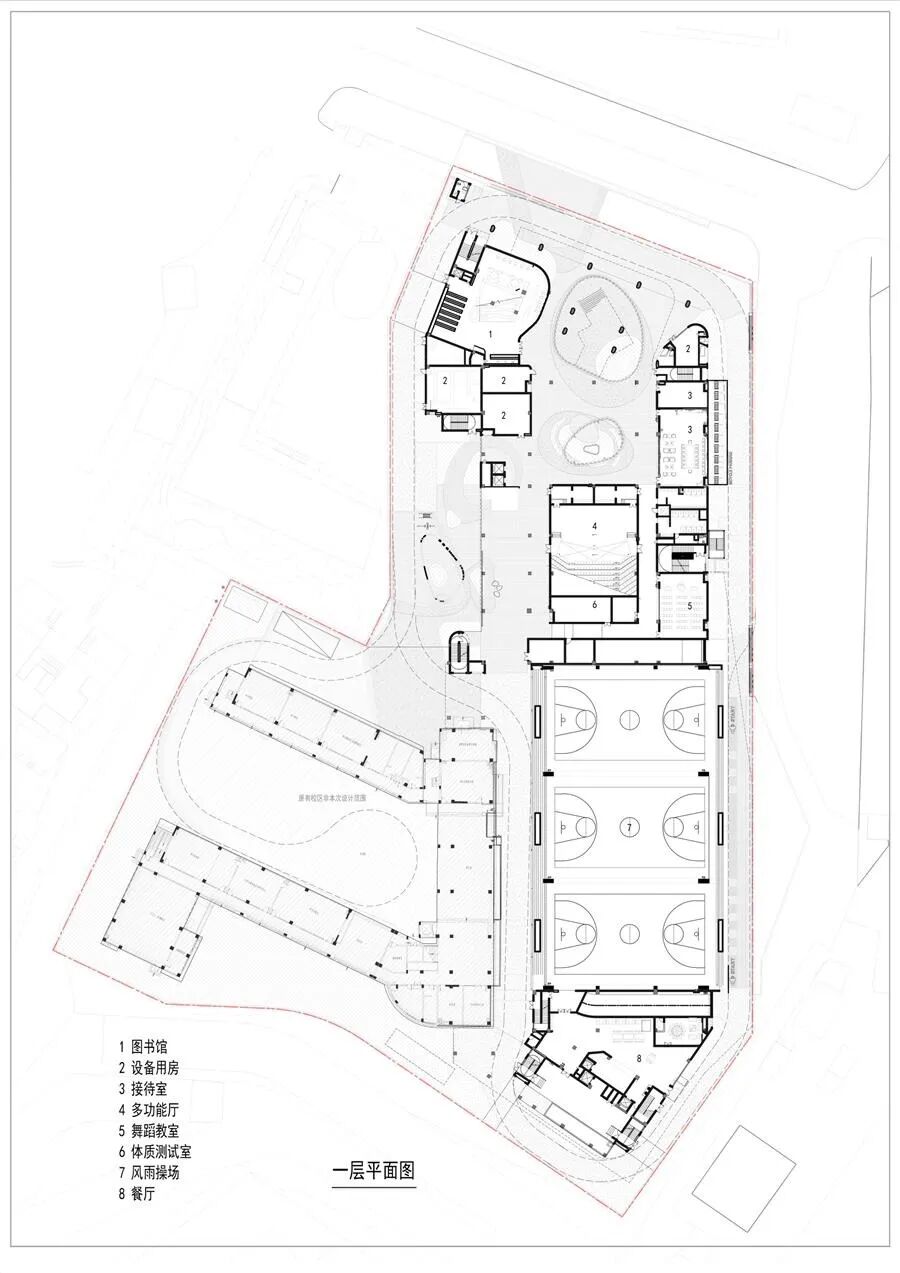 采用垂直向度的地形学处理手法,将体育馆、报告厅等大体量功能单元作为基座层嵌入场地,使教学组团以悬浮姿态建构于场地之上。二者之间逐级跌落的台地产生空间活力,成为孩子们嬉笑翻闹的“山谷”。