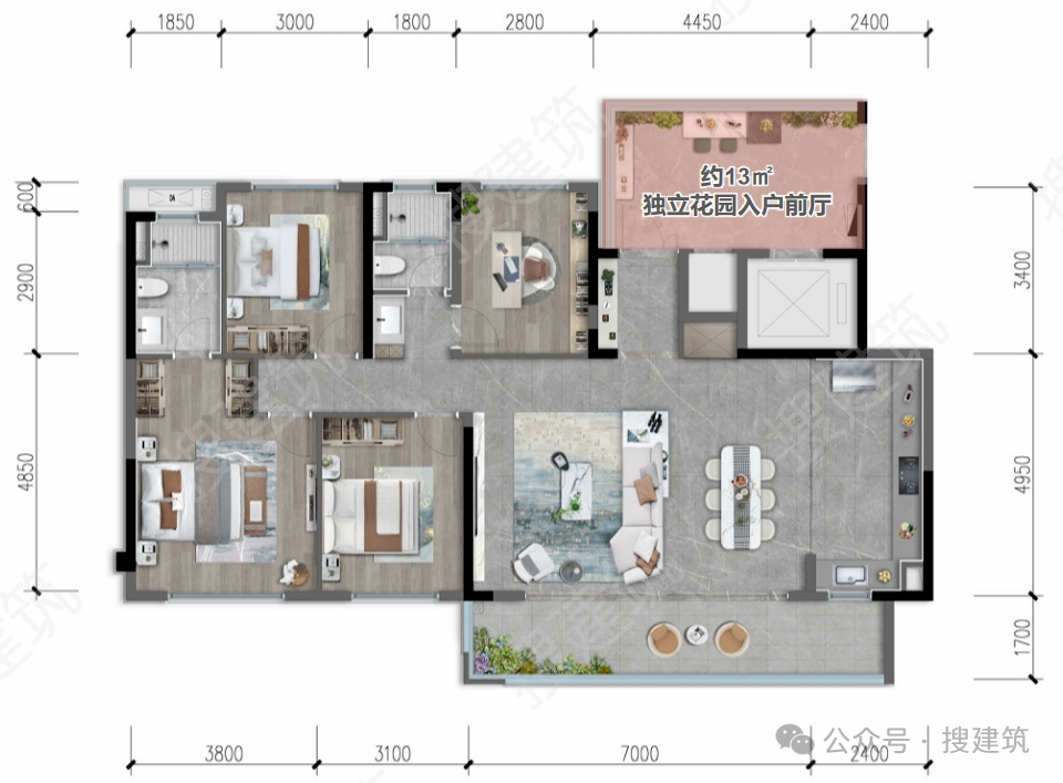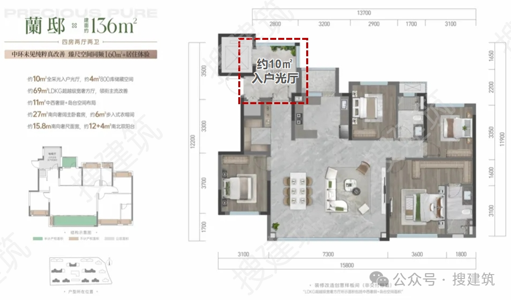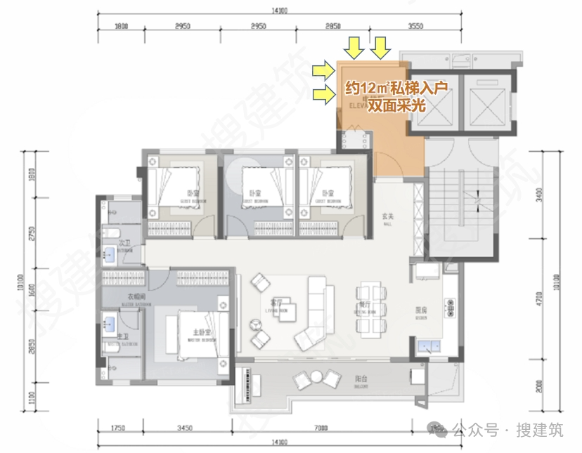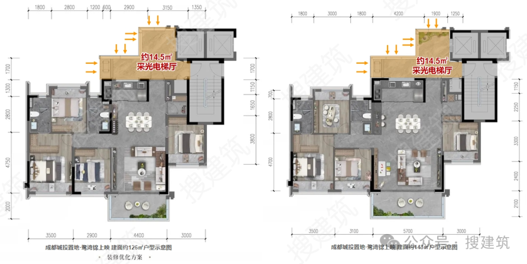 搜建筑发现市场一直在不断地对户型迭代升级,其中,花园式全明电梯厅(入户光厅)已成为“卷王”户型必备。