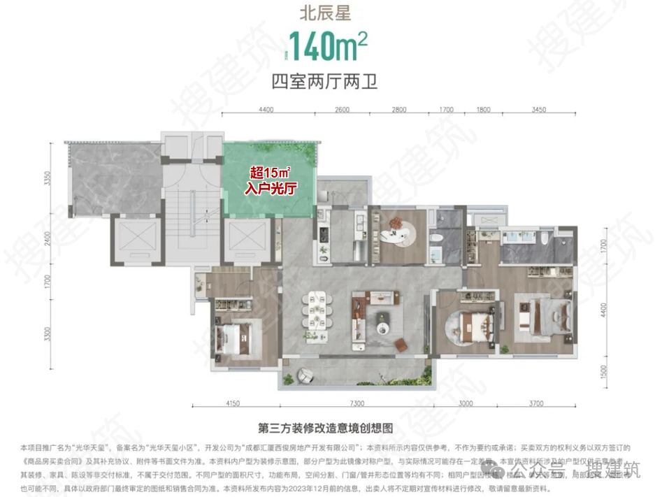 比如,成都汇厦德商·光华天玺建面约99、130、140㎡户型全部设置了入户光厅设计。其中建面约140㎡户型进一步升级功能性与尺度感,达到超15㎡入户光厅,尺度直逼180㎡户型。