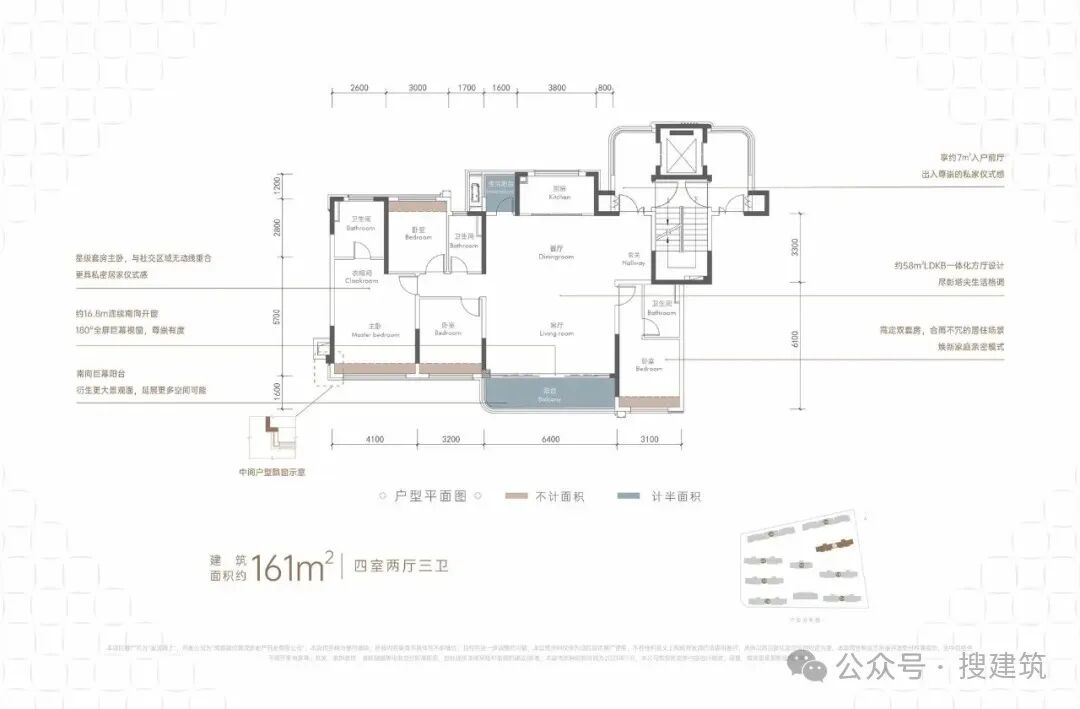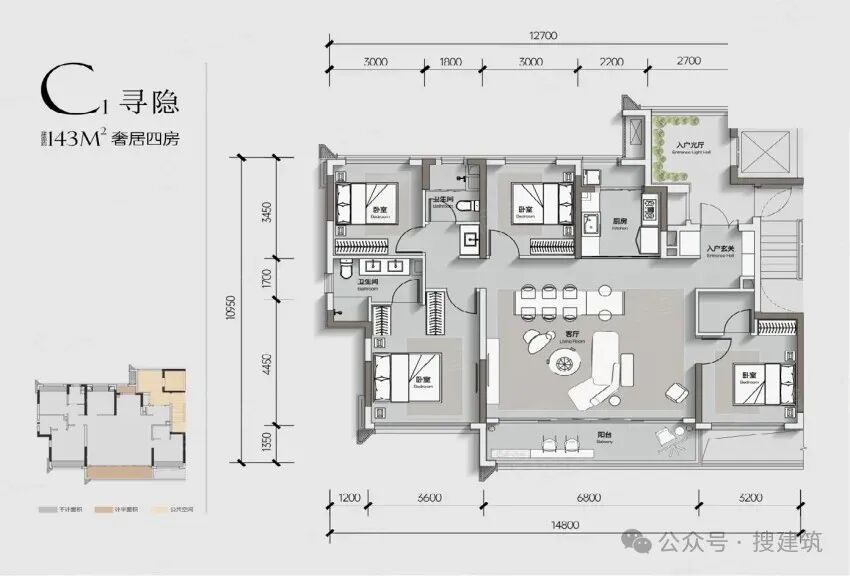 比如成都龙湖三千云锦建筑面积约143㎡户型,2梯2户,电梯前厅相对独立,每一户都能拥有一个专属的入户空间。