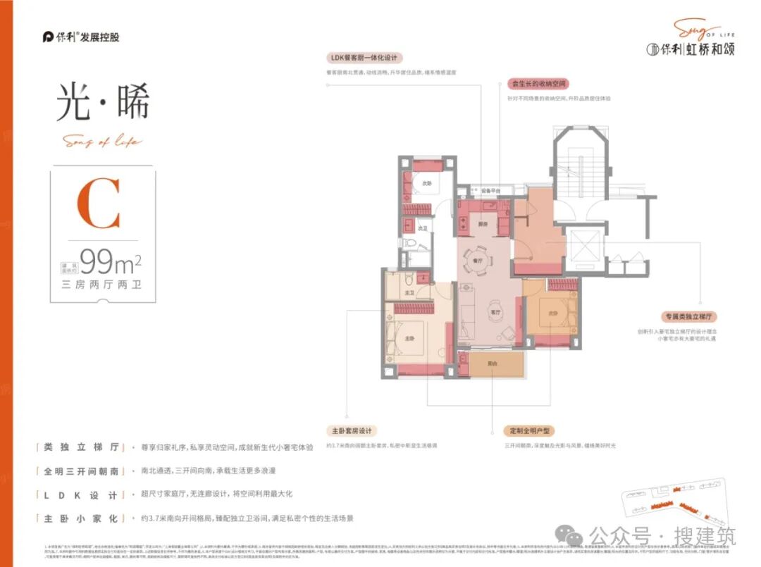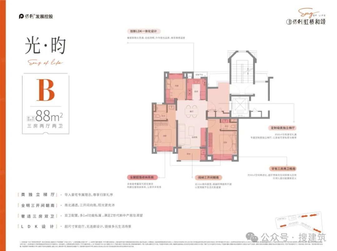 比如,上海保利|虹桥和颂建面约88/99㎡的3房户型,竟然设计了类一体一户,为业主精心打造了一个全明独立的电梯入户空间!