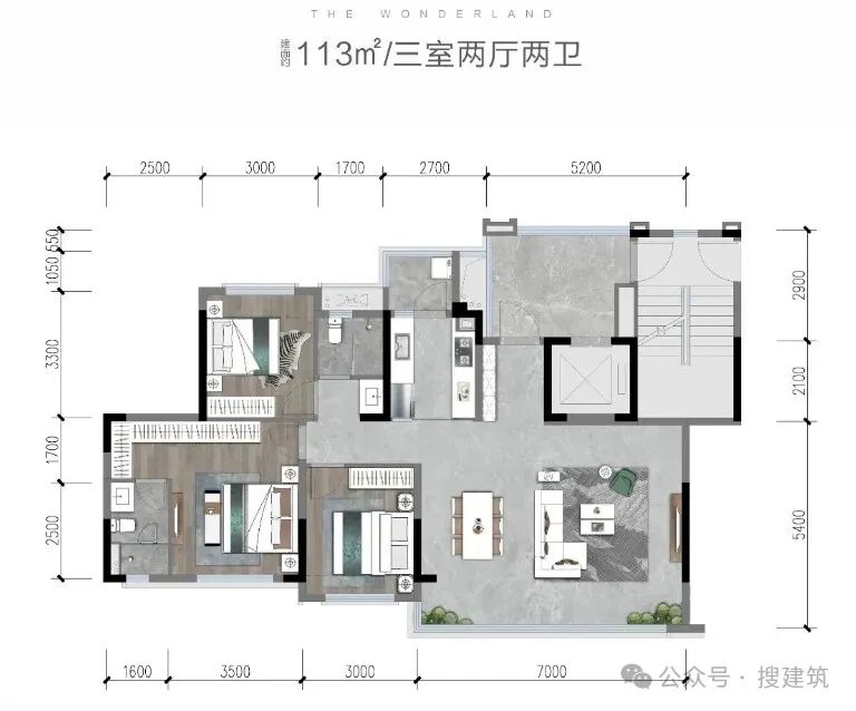 成都邦泰云璟建面约113㎡户型,2T2户的梯户比下,独立电梯前室面积有近10㎡。