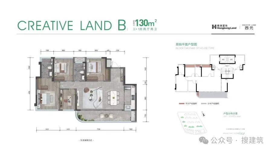 成都香港置地·西元建面约130㎡四房户型,两梯两户格局下,每一户都有独立且全采光的电梯厅空间。