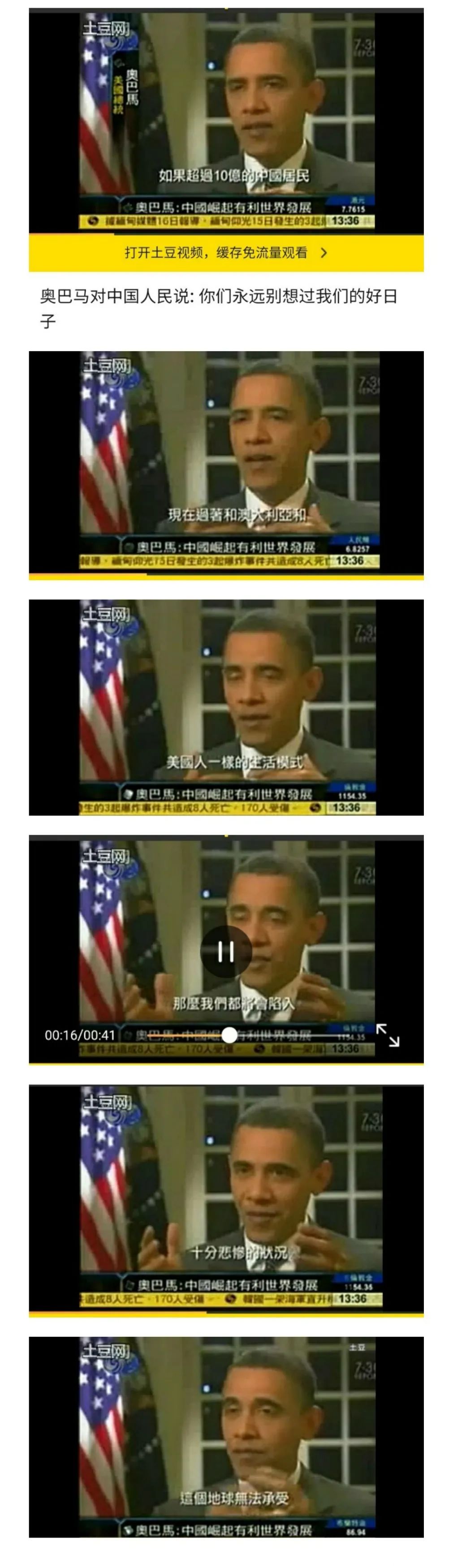 奥巴马通过电视镜头向全世界明确宣布:如果10多亿中国人口也过上与美国和澳大利亚同样的生活,那将是人类的悲剧和灾难,地球根本承受不了。