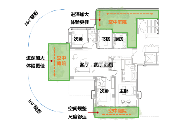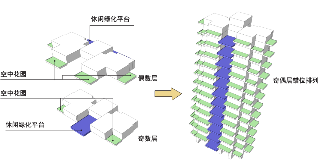 竖向空间上,进一步通过精细化设计,实现奇数层和偶数层的庭院位置相错,保证每一个庭院上空都有两层的挑高,总层高达到6.2米,横向和纵向都具备舒展大尺度空间,真正达到了“卧可观天,手可摘星”的庭院体验,也让更多的阳光、空气进入庭院和户内,促进植物的光合作用和生长。