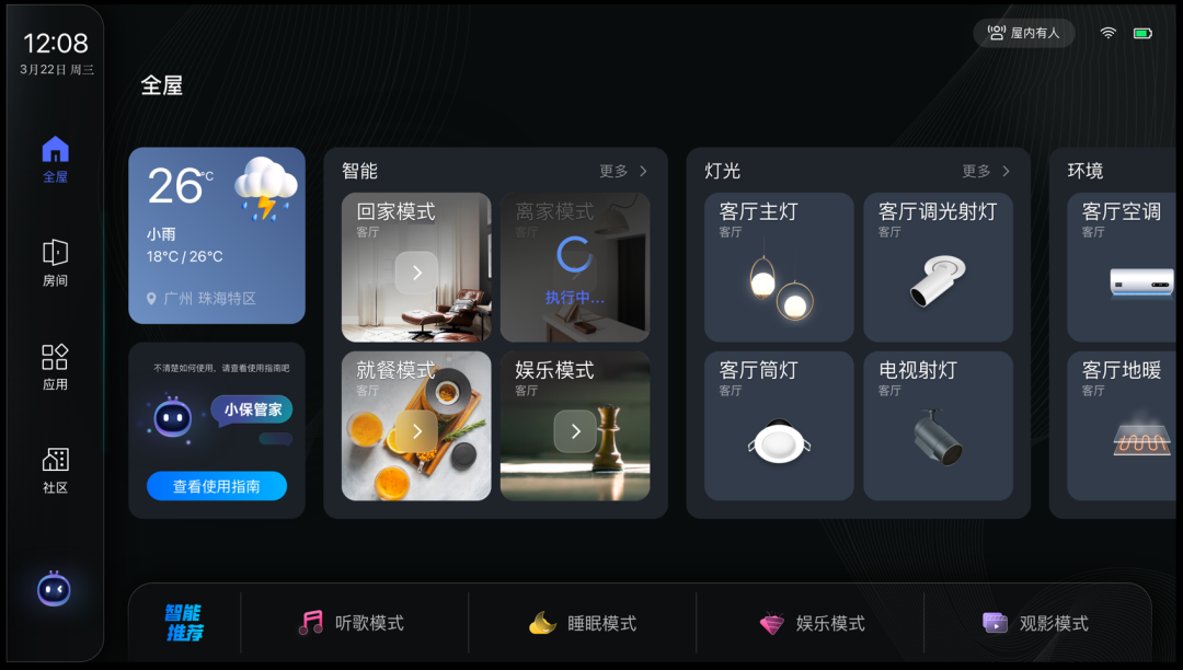 通过保利定制的智能控制系统,将新风、空调、地暖进行联动,可根据环境指标、时间段自动调节设备,营造四季如春的室内环境,更可以根据使用者和使用场景,设置老人、儿童、睡眠、运动等专属模式,实现恒温、恒湿、恒氧、恒智。而在厨房配置的专用防油烟空调、各类设备加载的消毒模块,则保证室内空气达到恒净。所有设备均采用超低分贝噪音设计,让环境实现恒静。