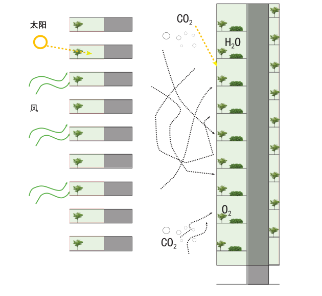 通过把地面的庭院搬到都市上空,让每一层拥有一个公共庭院,每户享有自己的私人庭院,可以种花种菜,遛狗养鸟,也让建筑的外墙成为布满植物的“景观”。