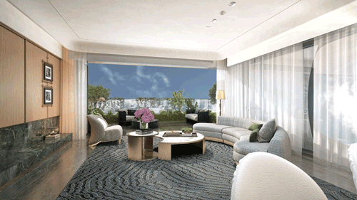 每一层住户都可以从客餐厅任意位置进入观景花园露台,北向的书房串联聚会花园露台,厨房也与之进行空间的联动,花园成为一家人品茗、聚会、休憩的场所;南向的双卧套房联通着私享花园露台,拓展了主人的个人空间。