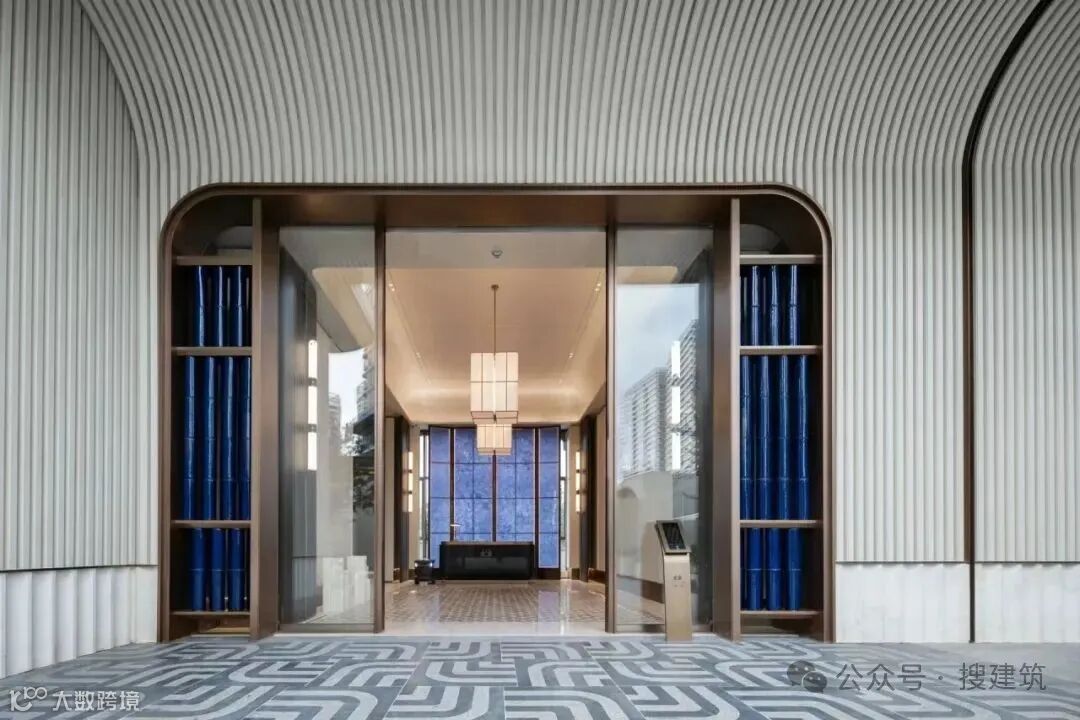 建筑基座特色拱廊造型与主入口门廊相呼应,方圆之间,沉稳雅致,门厅两侧的屏风格栅,也延续主入口蓝紫色釉面陶筒双层错缝拼装,细腻的釉面肌理,尽显精致独特、典雅尊贵。