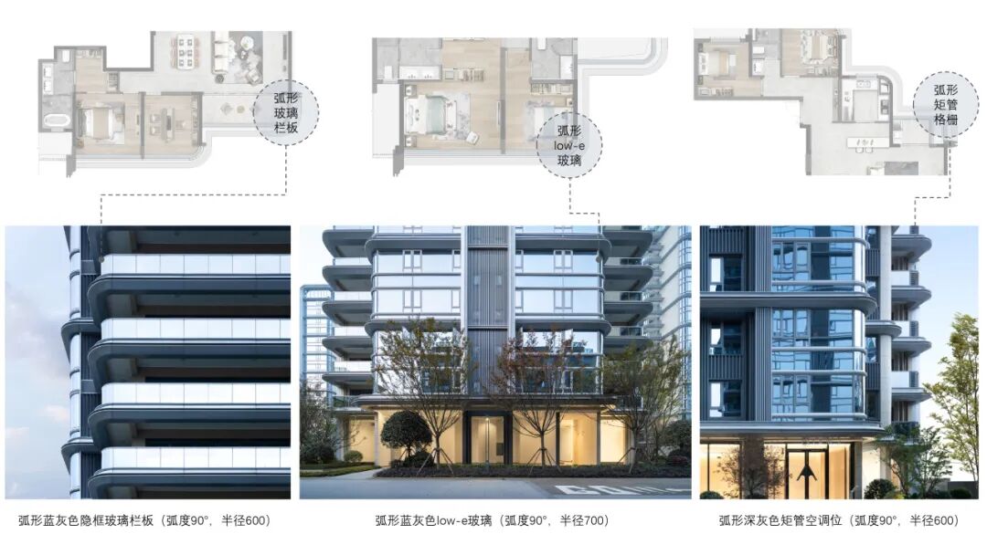 在阳台部分不仅使用了造价高昂的弧形玻璃,而且玻璃栏板局部采用彩釉工艺,与底部弧形铝板相互呼应,使楼栋外立面更加精致典雅。