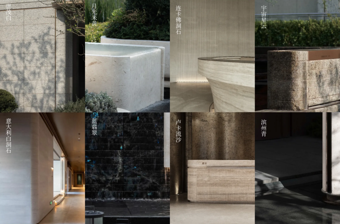 招商玺展示区内,奢石是运用极多,据介绍,采用了来自全球的18种奢石,结合多种多样的工艺打造,呈现出千变万化的效果,石材运用也为社区赋予了“永恒质感”。