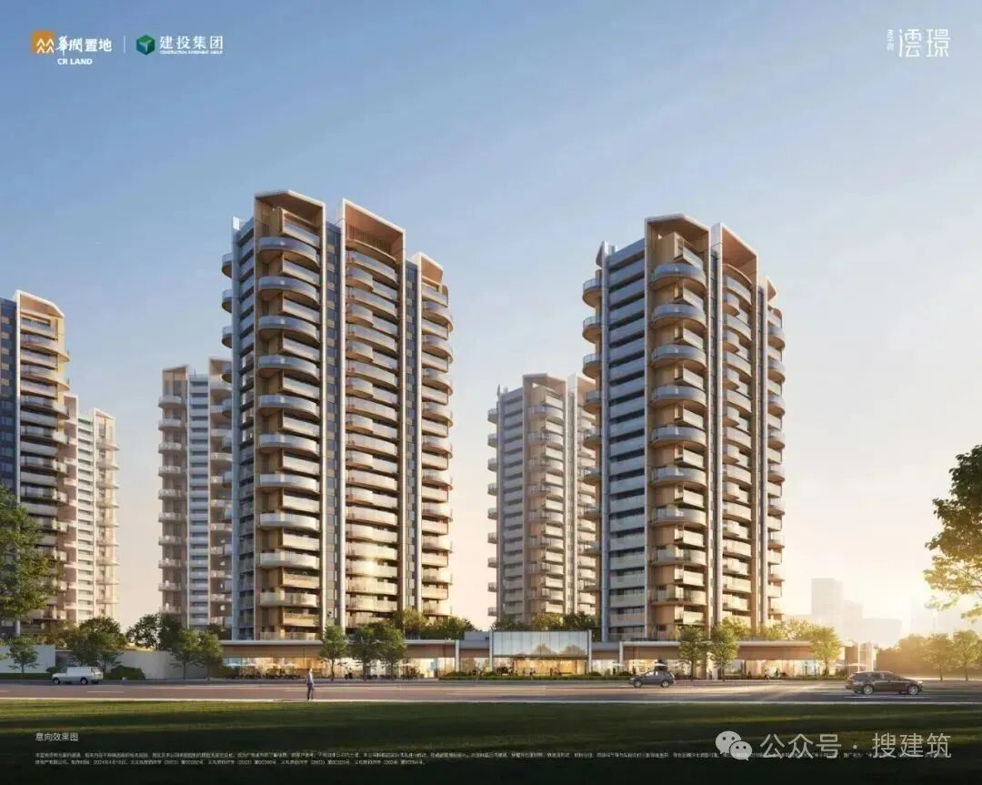 成都保利·新川天珺流光玉宇的公建化立面,引入生长态势的立面设计语言,与自然、公园、绿树相呼应,简洁的“弧”形立面语言,组合内在秩序,形成住宅群像的标志感,成为城市视觉名片。