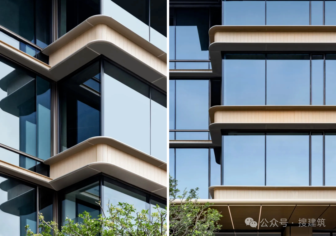 横向的弧形倒角,由玻璃+铝板热熔而成,金属大折板让楼体转角自然流畅。