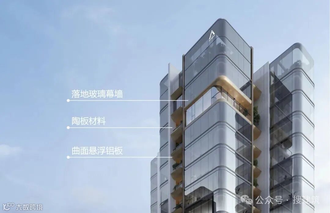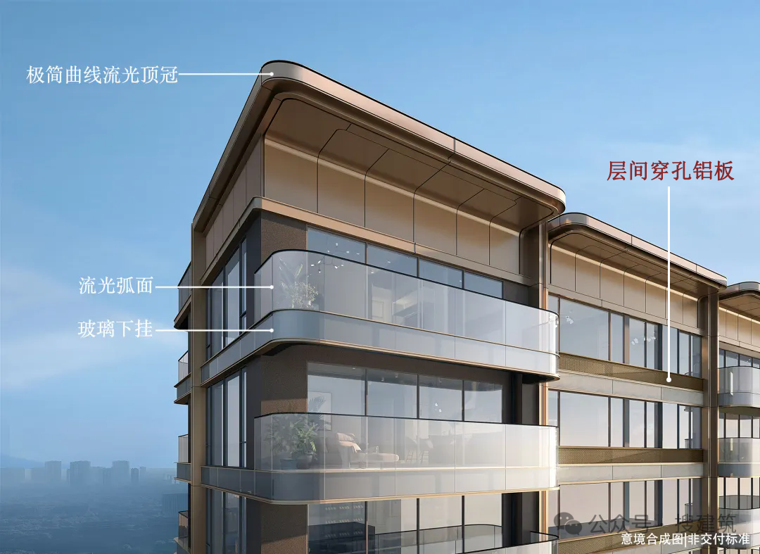 立面大量采用曲线元素,形成云朵般流畅柔和的线条,创造飞瀑直下的流畅感。大比重选用巨幕玻璃窗+暗金色铝板,首层使用珍珠蓝石材,并在建筑轮廓上搭配金属质感线条,超高窗地比约0.35-0.6,由此模糊了室内外空间的界,打造类似“无边框曲面屏”的外立面。
