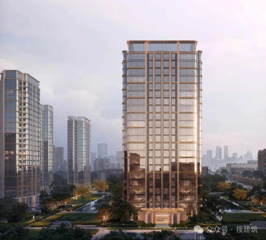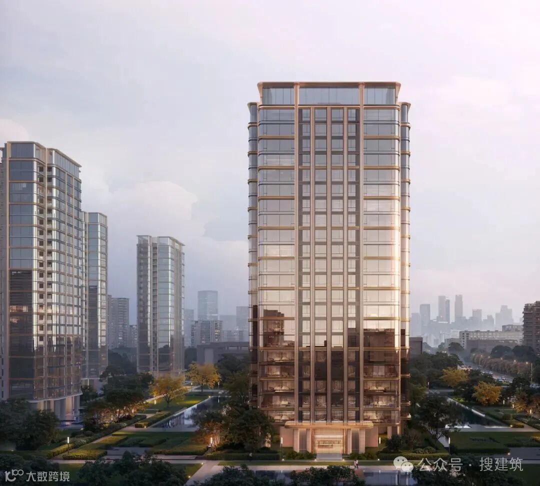 比如,宁波首个金釉陶板立面——宁波保利·明湖金茂府,搜建筑认为这个项目的外立面可谓是花尽了心思,“金釉陶板”与“冰川瀑布玻璃”1:0.5的融合运用,完美演绎着国际范十足的东方作品。