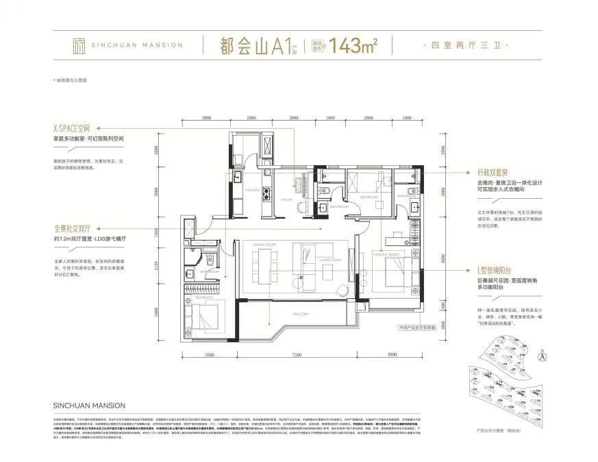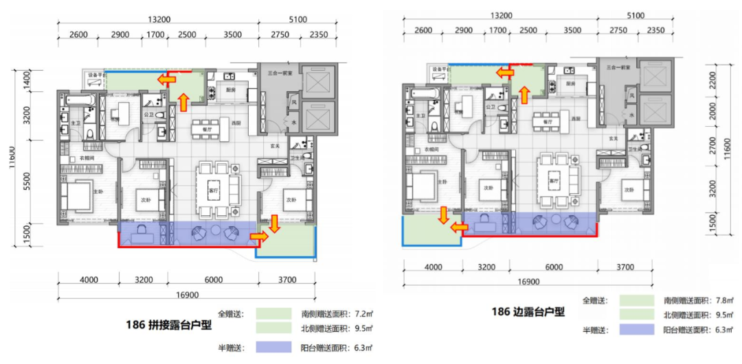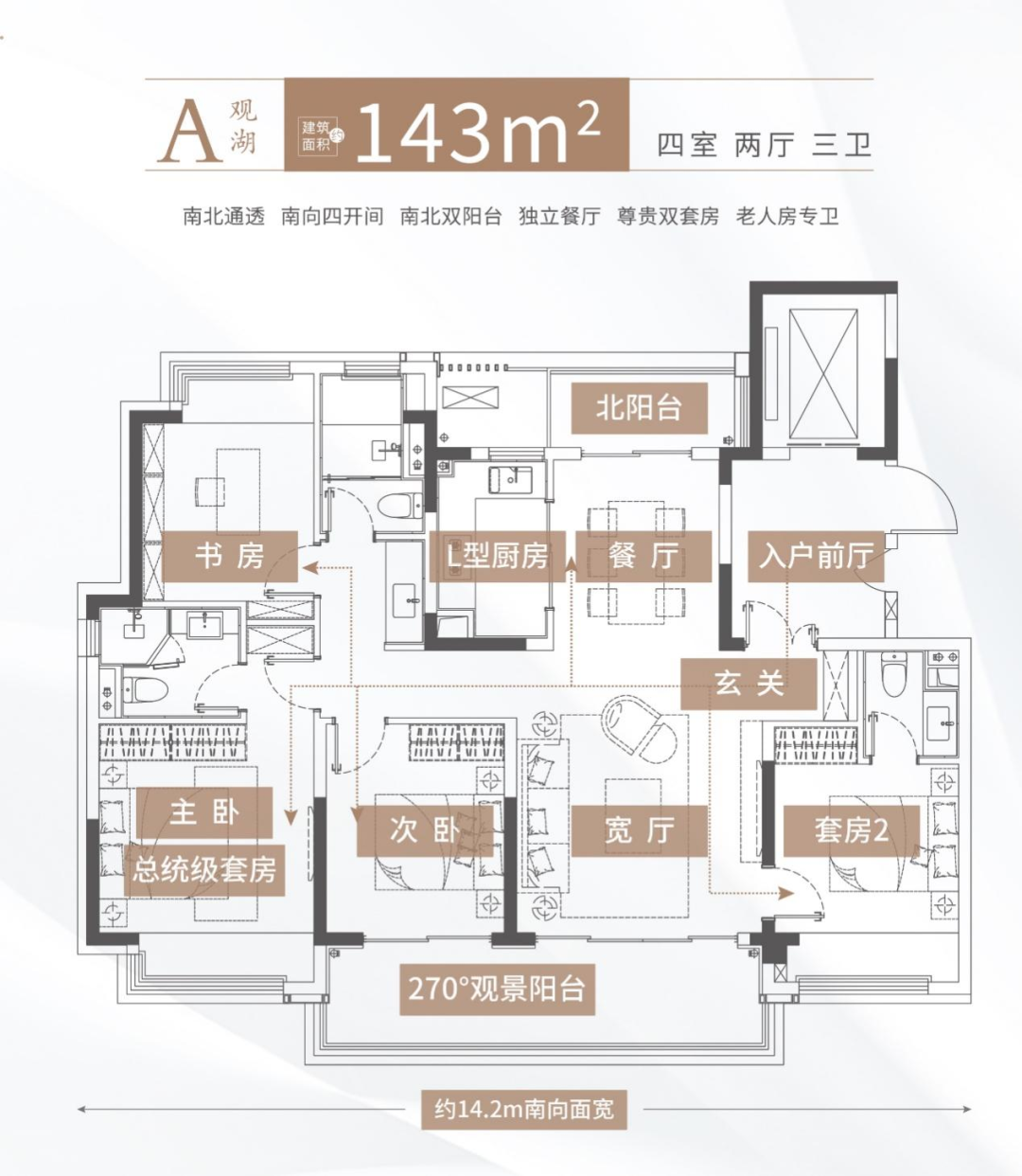 这个户型有着约14.2米的南向面宽,客厅直通南向超宽双联阳台,全屋飘窗设计、双联大阳台,预留大量收纳空间,整体得房率不低, 四房三卫南北双向阳台,全能户型。