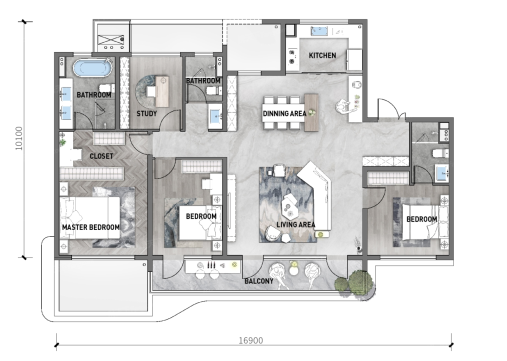 朝南面宽达到了约15.4米,而且配置了整整约8.2米的双联南向阳台,三段式的主卧极具仪式感。