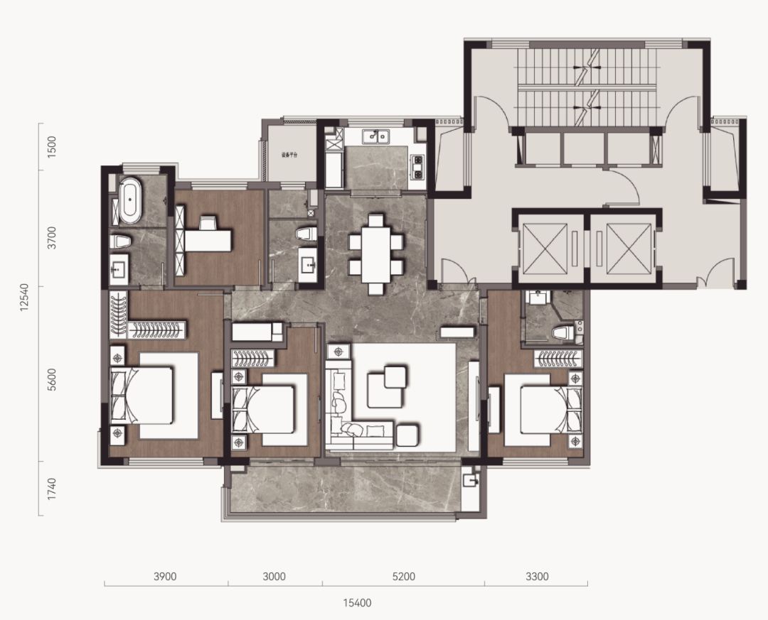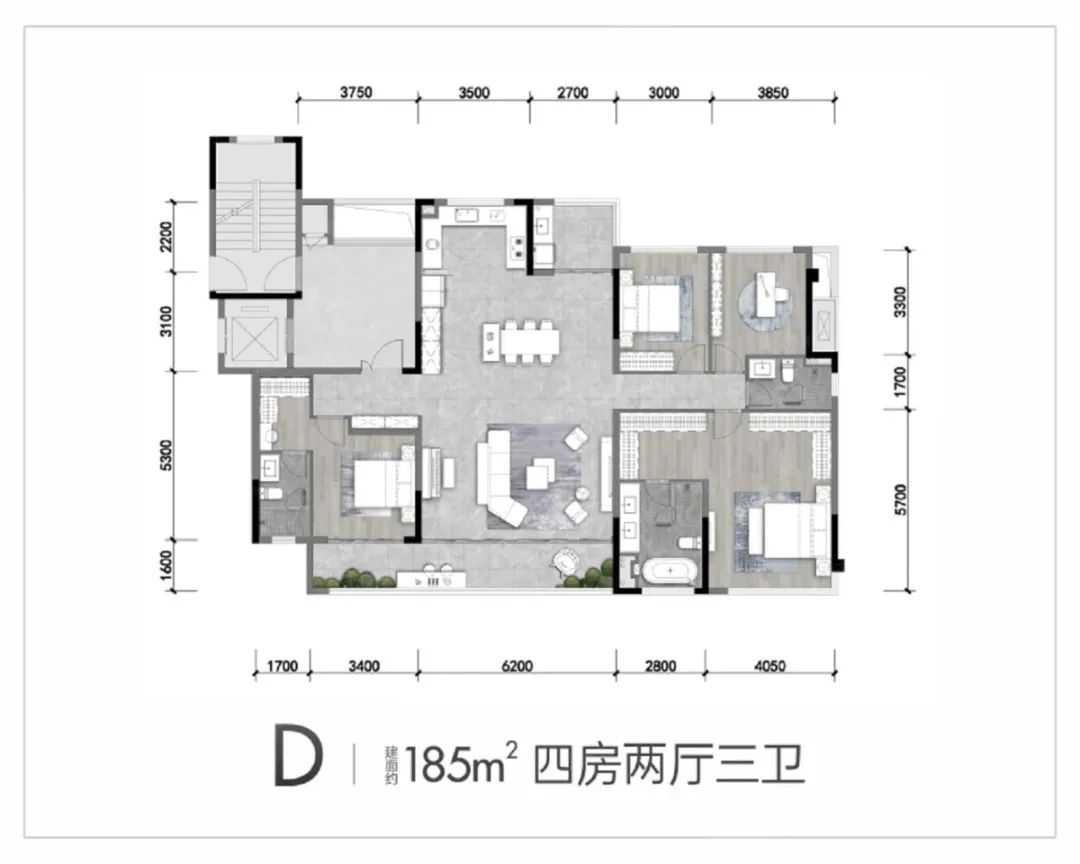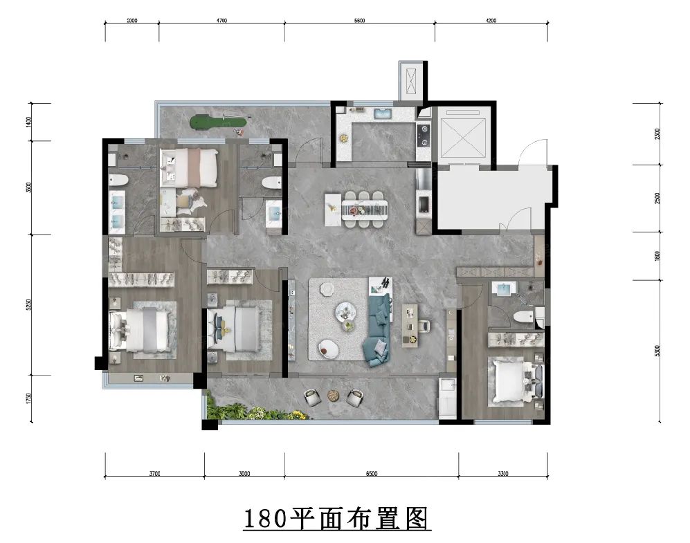 当下市场的四房产品对空间重新划分,采用双套房设计,能更好尊重家人生活习惯与边界,其中一件作为老人套房或者孩子的套房,避免两代人生活干扰,并且拥有独立的生活空间。
