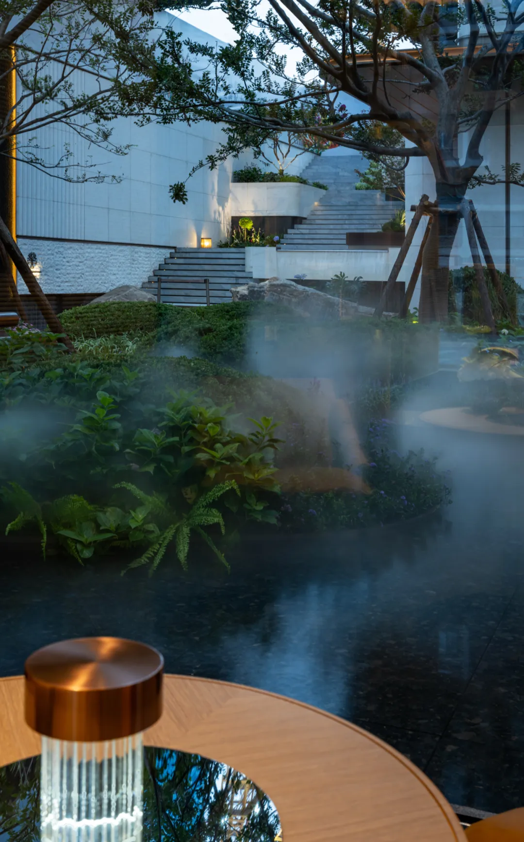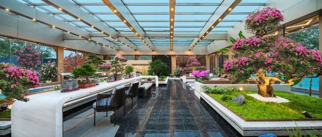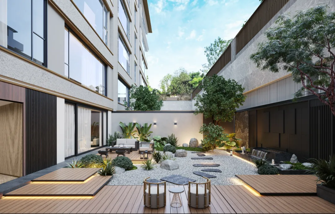 项目打破传统平面布局匠心构筑最高约8米台地立体园林。精心打造约600m下沉层叠水庭,引用斯卡帕艺术技法,整石铺就亚马逊绿奢石。