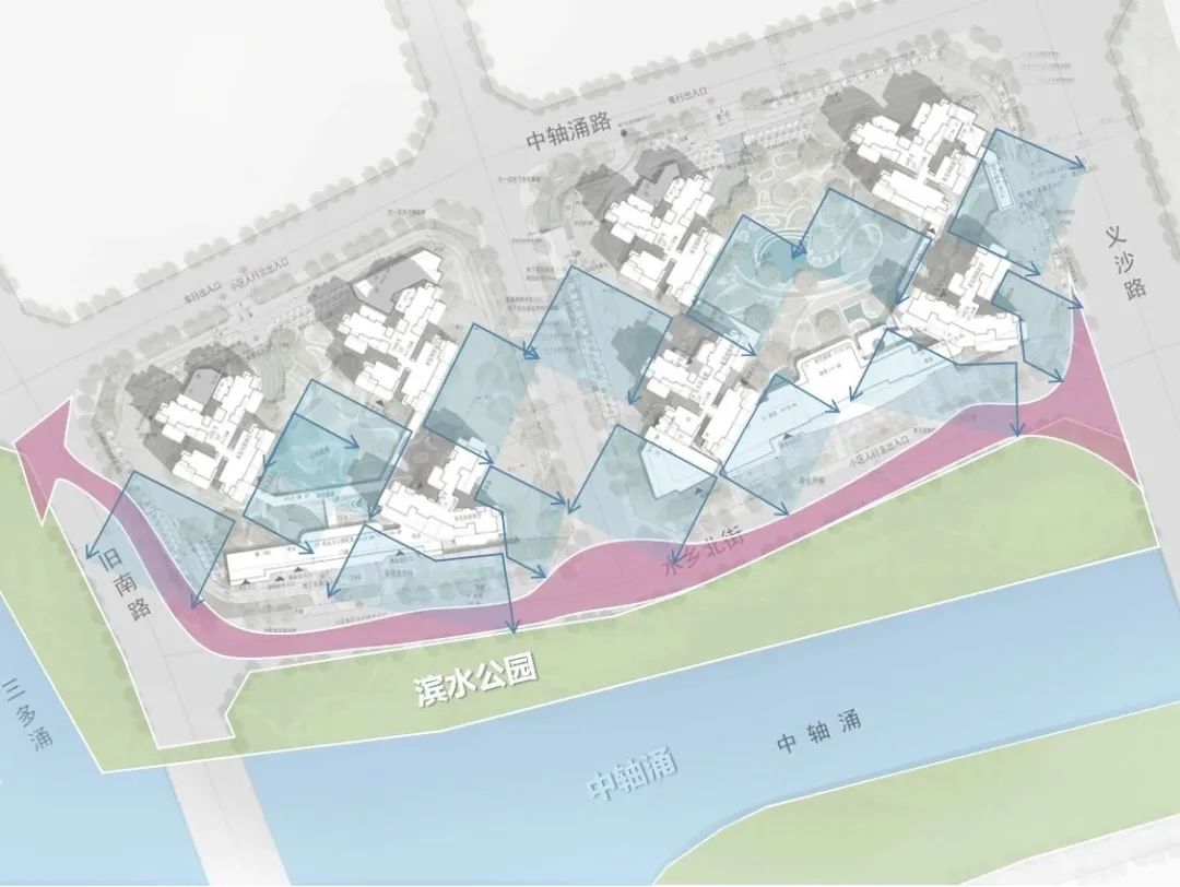 利用法线错开原则,消化建筑间距,保证最长直线一线河涌景观界面;同时结合用地条件及外部景观资源,通过角度偏转延伸视线,实现一线水景界面建筑观景角度最优。