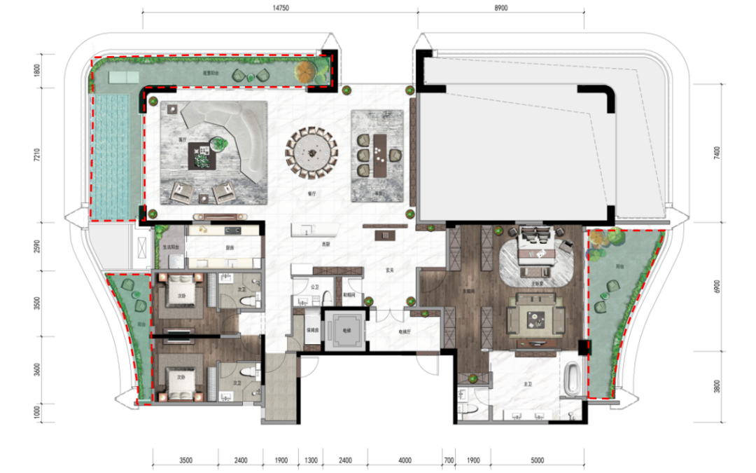 重庆万科锦绣滨江约326平米户型,全景大落地玻璃窗、超长观景阳台,以达到景观视野最大化。