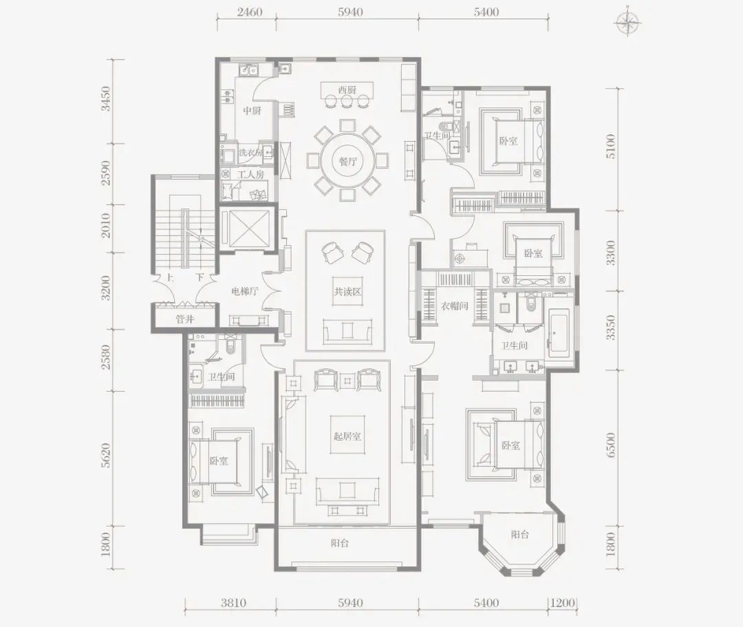 北京城建·世华龙樾作为“楼王”户型的330平米四室三厅三卫产品,户型方正通透,南向三面宽达到16.35米,尺度远远好于同面积别墅产品。