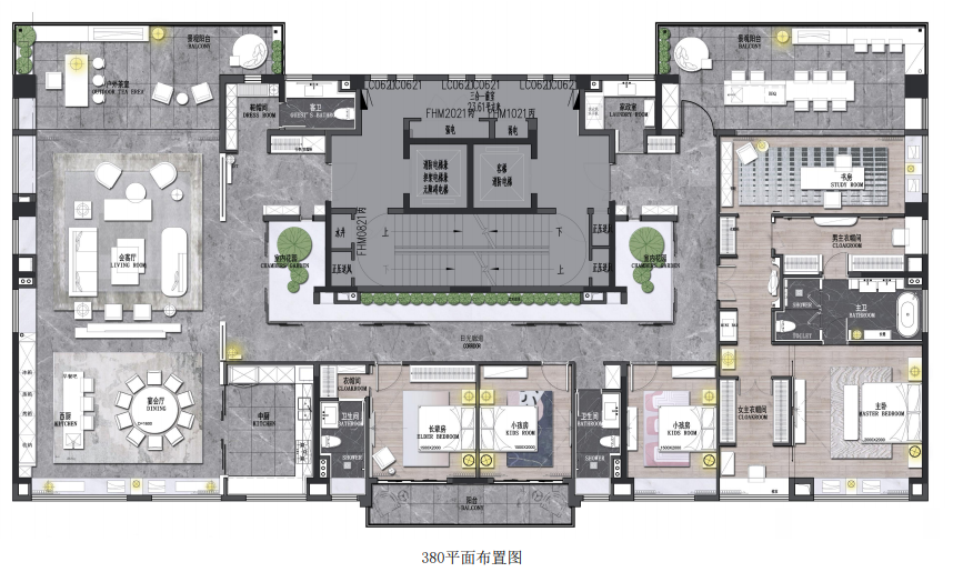 下面这个400多平的大平层,涵盖了豪宅的标配:保姆间、中厨、西厨、衣帽间。