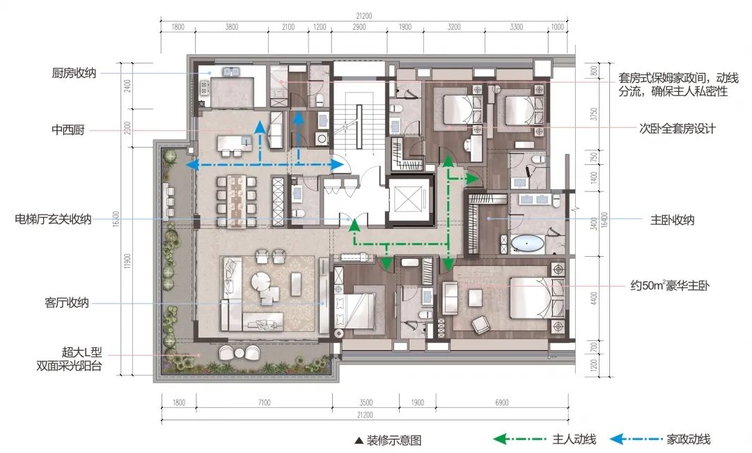 双动线入户,主人及宾客主动线与后勤服务次动线互不干扰。